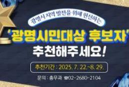 광명시(시장 박승원)는 오는 8월 29일까지 ‘제37회 광명시민대상’의 주인공을 찾기 위해 후보자를 추천받는다.광명시민대상은 지역사회 각 분야에서 근면·성실한 자세로 봉사하며 시 발전과 명예를 위해 헌신한 시민 또는 단체에게 수여하는 상이다.추천 대상은 다양한 분야에서 적극적인 봉사활동으로 지역사회 발전에 헌신해 온 개인 또는 단체로, 광명시민 누구나 본인을 제외하고 자유롭게 추천할 수 있다.후보자 자격은 추천 공고일인 7월 21일 기준으로 최근 3년 이상 광명시에 계속 거주하거나 관내에 사업장(직장)을 둔 시민 또는 단체면 가능하