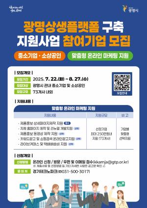 광명시(시장 박승원)는 오는 8월 27일까지 ‘광명상생플랫폼’에 입점해 온라인 마케팅을 확대하고자 하는 73개 중소기업·소상공인을 모집한다.‘광명상생플랫폼’은 관내 중소기업과 소상공인을 대상으로 맞춤형 온라인 마케팅, 콘텐츠 제작, 유통 채널 연계 등 종합적인 지원을 제공하는 광명형 통합 온라인 플랫폼이다. 단순 입점에 그치지 않고, 실질적인 매출 확대와 브랜드 인지도 향상을 도모하는 것이 핵심이다.최종 선정된 기업에는 ▲제품 상세페이지 제작 ▲자체 홈페이지 구축 및 리뉴얼 ▲제품 홍보 영상 제작 ▲키워드 광고, 쇼핑 검색 등 온라