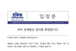 목, 2025/07/31- 00:00 에 admin 에 의해 제출됨 관련 개인/그룹 민주당 전북도당 정당 더불어민주당 지역 전북 카테고리 보도자료·성명·논평 25.07.31_[입장문]_한미_관세협상_합의_환영_v1.0.hwp최창호 부대변인.jpg 링크 https://jeonbuk.theminjoo.kr/party/sub/news/view.php?brd=60&post=1874&board_id=briefing Like 0 Dislike 0 1 view 댓글 달기 이름 제목 Comment 저장 Preview Leave this field blank