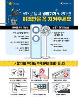광명소방서(서장 이종충)는 본격적인 무더위와 함께 에어컨, 선풍기 등 냉방기기 사용이 늘어남에 따라 여름철 전기화재 예방을 위한 집중 홍보 활동을 펼치고 있다.여름철 전기화재는 냉방기기 사용 부주의, 먼지 축적, 노후된 전선 또는 장시간 사용에 따른 과열 등 일상 속 원인에서 쉽게 발생한다. 특히 에어컨과 선풍기는 한 번 작동하면 오랜 시간 가동되는 경우가 많아 화재에 더욱 취약한 만큼 올바른 사용법과 사전 점검을 통한 예방이 무엇보다 중요하다.여름철 전기화재 예방을 위한 안전 수칙으로는 ▲에어컨 전용 콘센트 사용 ▲작동 전 플러그
