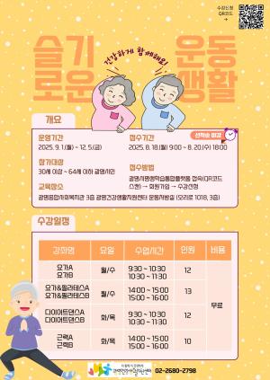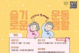 광명시 건강생활지원센터가 오는 18일 오전 9시부터 20일 오후 6시까지 ‘슬기로운 운동생활 3기’ 참가자를 선착순 모집한다.프로그램은 오는 9월 1일부터 12월 5일까지 운영하며, 요가, 요가·필라테스, 다이어트 댄스, 근력운동 등으로 구성해 다양한 신체활동을 경험할 수 있다.대상은 30세 이상 64세 이하 광명시민으로, 광명시 평생학습 통합플랫폼(LLL.gm.go.kr)에서 회원가입 후 신청하면 된다.한편, 광명건강생활지원센터는 5월부터 운영해 온 ‘슬기로운 운동생활 2기’ 프로그램을 오는 14일 마무리한다. 총 220회차에 걸