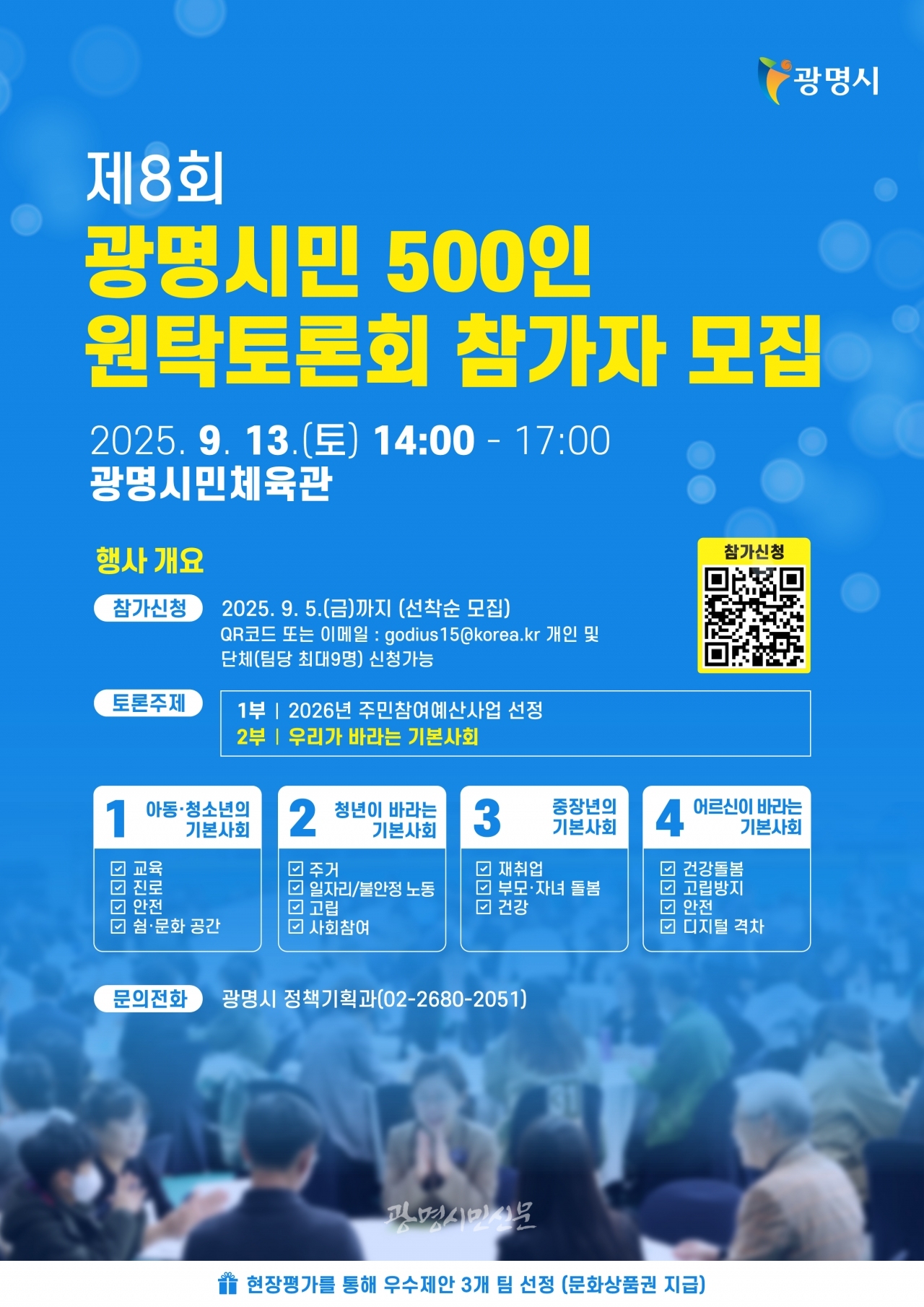 광명시(시장 박승원)가 ‘시민 의견이 곧 정책이 되는 도시’를 목표로 시민 500명과 함께 기본사회 청사진을 그린다.시는 오는 9월 13일 광명시민체육관에서 시민과 함께 지역의 미래를 그리는 ‘제8회 광명시민 500인 원탁토론회’를 개최한다.이번 토론회는 시민이 직접 시정에 참여해 정책을 제안하고, 지역사회가 함께 미래를 설계하는 ‘참여 기반 정책 설계의 장’으로 마련됐다.올해 토론회는 ▲1부 ‘2026년 주민참여예산 사업 선정’ ▲2부 ‘우리가 바라는 기본사회’ 두 가지 주제로 진행된다.1부에서는 시민 500인이 지역 실정에 맞춘