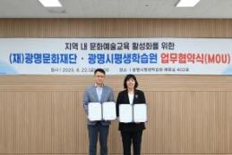 광명문화재단(대표이사 송은영)은 22일 광명시평생학습원(원장 정찬수)과 지역 내 문화예술교육 활성화를 위한 업무협약(MOU)을 체결했다고 밝혔다.광명시평생학습원에서 개최된 이번 협약식은 광명문화재단 송은영 대표이사와 광명시평생학습원 정찬수 원장을 포함한 각 기관 관계자들이 참석했다.이번 협약은 두 기관의 협력 체계를 한층 발전시켜 지역 문화시설의 활성화와 사업 운영의 효율성을 제고, 그리고 시민 참여 기회의 확대를 도모하고자 마련되었다.협약의 주요 내용은 ▲문화예술교육 사업 운영을 위한 공간 상호 협력 ▲문화예술교육 기획 및 운영