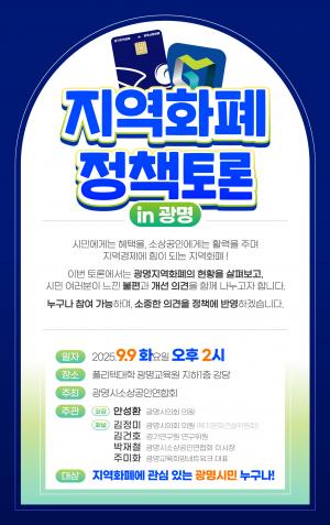 광명지역화폐의 현황과 개선 방향을 두고 시민과 소상공인이 함께 머리를 맞대는 정책토론회가 열린다. 오는 9월 9일(화) 오후 2시, 폴리텍대학 광명교육원 지하1층 강당에서 개최되는 「지역화폐 정책토론 in 광명」이 그 무대다.이번 토론회는 광명시소상공인연합회 주최로 현장에서 지역화폐를 사용하며 느낀 불편과 아쉬움을 시민과 소상공인들이 허심탄회하게 나누고, 실질적인 개선책을 모색한다.이번 토론회는 안성환(광명시의원)이 좌장으로 김정미(광명시의원), 김건호(경기연구원 연구위원), 박재철(광명시소상공인연합회 이사장), 주미화(광명교육희망