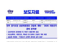 수, 2025/09/03- 00:00 에 admin 에 의해 제출됨 관련 개인/그룹 민주당 경기도당 정당 더불어민주당 지역 경기 카테고리 보도/논평 :250903민주경기도당상설위원장단간담회개최…\2026지방선거준비본격화\.hwp (1.3 Mbyte) 링크 https://www.minjookg.kr/sub01_news/press.php?board_page=1&board_mode=view&board_no=111636 Like 0 Dislike 0 댓글 달기 이름 제목 Comment 저장 Preview Leave this field blank