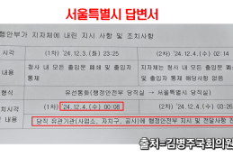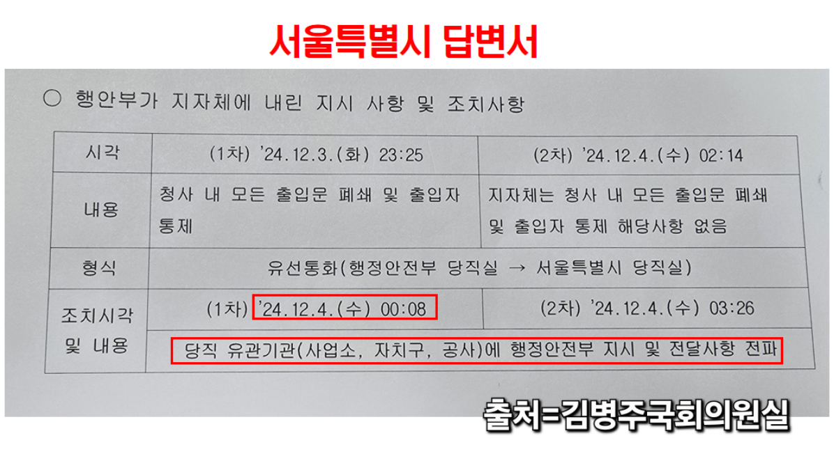 서울시가 최근(지난 8일 18시쯤) 국회에 제출한 자료에 따르면 2024년 12월 4일 0시 8분 서울시는 산하 유관기관(사업소, 자치구, 공사)에 행정안전부 지시사항(청사 출입문 폐쇄 및 출입자 통제)을 전달했습니다.
