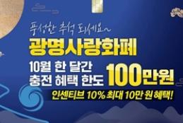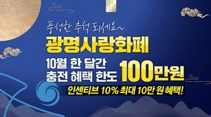 광명시가 ‘광명사랑화폐(지역화폐)’ 충전 한도를 10월에도 100만원으로 상향한다고 지난 9일 밝혔다. 100만 원을 충전하면 인센티브 10%가 추가돼 총 110만 원을 사용할 수 있다.시는 지난 7월 인센티브 지급 한도를 당초 30만 원에서 70만 원으로 대폭 확대한 데 이어 9월에는 100만 원으로 추가 확대했고, 추석 명절이 있는 10월에도 지역 소비 진작을 위해 혜택을 이어간다.두 달 연속 충전 한도를 100만 원으로 확대한 것은 2019년 광명사랑화폐 발행 이후 이번이 처음이다. 이는 정부의 지역화폐 확대 기조에 발맞춰 민