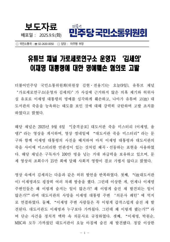 화, 2025/09/09- 00:00 에 admin 에 의해 제출됨 [0] 관련 개인/그룹 민주당 중앙당 정당 더불어민주당 지역 미특정 카테고리 보도자료 250909화_가로세로연구소_허위사실_명예훼손_유포_고발.pdf공유 공유하기 닫기페이스북트위터카카오톡URL 복사 링크 https://theminjoo.kr/main/sub/news/view.php?sno=0&brd=188&post=1213428&search= Like 0 Dislike 0 댓글 달기 이름 제목 Comment 저장 Preview