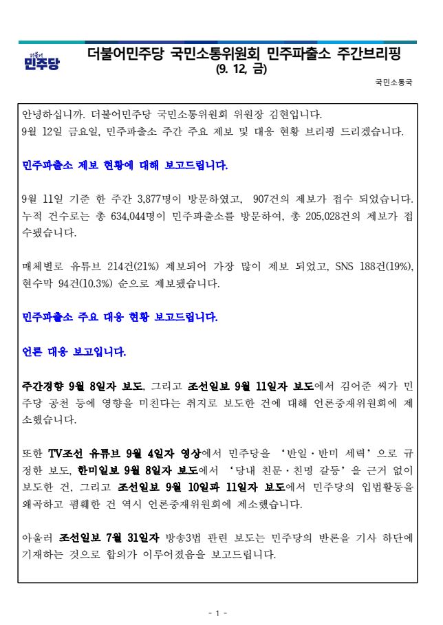 금, 2025/09/12- 00:00 에 admin 에 의해 제출됨 [0] 관련 개인/그룹 민주당 중앙당 정당 더불어민주당 지역 미특정 카테고리 보도자료 국민소통위원회_주간_민주파출소_브리핑250912.pdf공유 공유하기 닫기페이스북트위터카카오톡URL 복사 링크 https://theminjoo.kr/main/sub/news/view.php?sno=0&brd=188&post=1213478&search= Like 0 Dislike 0 댓글 달기 이름 제목 Comment 저장 Preview