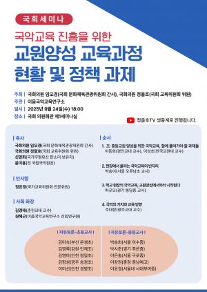국악교육 진흥과 교원양성 교육과정 개선 방안을 모색하기 위한 국회 세미나가 오는 24일(수) 저녁 6시, 국회의원회관 제1세미나실에서 열린다. 이번 세미나는 국회의원 임오경(국회 문화체육관광위원회 간사)과 국회의원 정을호(국회 교육위원회)가 공동 주최하고, 이음국악교육연구소가 주관한다. 본 세미나는 교원양성 교육과정 속 국악교육의 제도를 점검하고, 공교육 현장에서 실질적으로 적용할 수 있는 구체적 개선 방안을 마련하는 것이 목적이다. 본 세미나는 유튜브 ‘정을호TV’ 채널을 통해 생중계되며, 온라인으로도 누구나 시청할 수 있다. 본