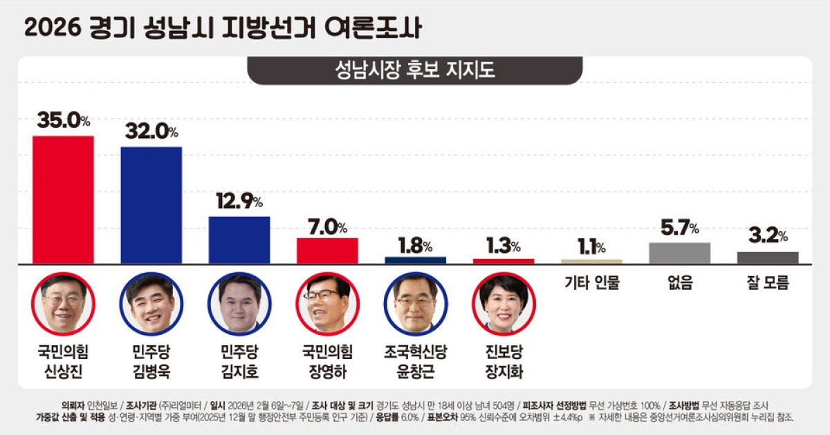 월, 2026/02/09- 06:00 에 admin 에 의해 제출됨 지역 성남시 오는 6·3 지방선거를 앞두고 실시된 성남시장 여론조사에서 국민의힘 신상진 성남시장과 더불어민주당 김병욱 전 청와대 정무비서관이 선두권에서 접전... 링크 https://v.daum.net/v/20260209060023586 Tags 지방선거 Like 0 Dislike 0 댓글 달기 이름 제목 Comment 저장 Preview Leave this field blank