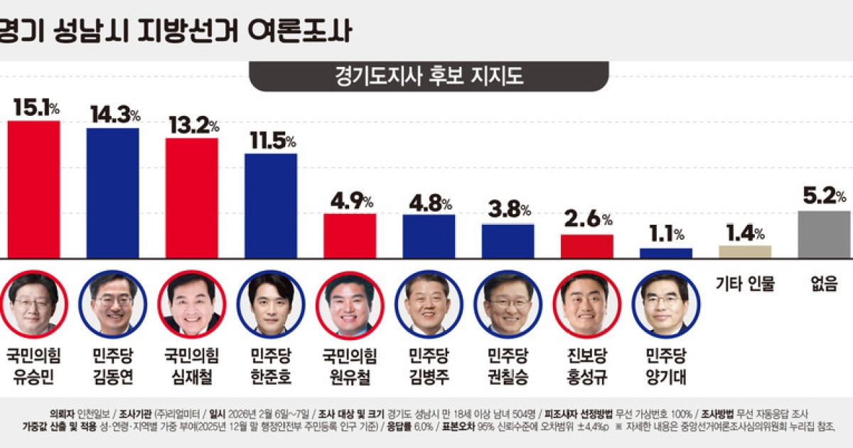 월, 2026/02/09- 06:00 에 admin 에 의해 제출됨 지역 경기 성남시민을 대상으로 한 여론조사에서 차기 경기도지사 후보군이 5파전 구도를 보이는 것으로 나타났다. 8일 인천일보 의뢰로 리얼미터가 성남시민을 ... 링크 https://news.google.com/rss/articles/CBMiRkFVX3lxTFBJNjJYVFl4cEM1a3ZmaXNFcnlNN3pLNjZtU2ZBcXlSRXZHRUJ2S29MX0hiMjdvbHhfQWVUclZlYmY3NTNYQWc?oc=5&hl=en-US&gl=US&ceid=US%3Aen Tags 지방선거 Like 0 Dislike 0 1 view 댓글 달기 이름 제목 Comment 저장 Preview Leave this field blank