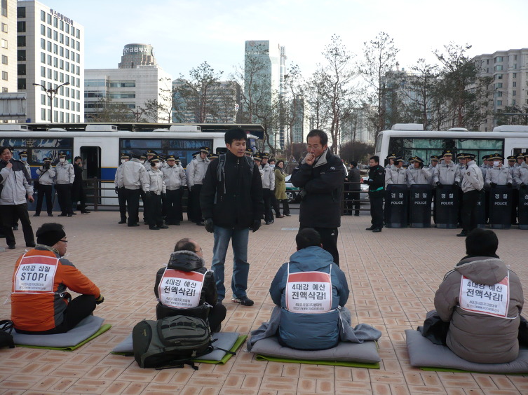 12월 14일(월) 4대강사업 저지범대위는 MB정부의 일방적인 4대강 사업 속도전을 규탄하고 예산 삭감을 위한 비상행동에 돌입하였다. 4대강사업저지범대위는 비상행동 선포식을 시작으로 국민들 70%가 반대하는 반민생4대강사업 예산삭감을 촉구하며 이번 예산국회가 끝날 때까지 노상 농성을 시작하기로 하였다. 그런데 노상 농성한지 45분만에 서부경찰서에서는 불법집회로 간주하여 전원 연행하는 사태가 벌어졌다. 연행된 사람들은 총 4명 박용신 환경정의처장, 박진섭 생태지평부소장, 한상민 녹색연합국장, 이철재 환경운동연합국장. mb정권의 무력으로 침묵 노상 농성 중인 활동가들은 어떠한 저항을 하지 못하고 연행되었다. 잠시후 정부의 4대강 사업과 더불어 이번 불법연행을 규탄하기위해 김홍철 환경정의국장이 1인시위를 하였는데. 이마저 불법집회로 간주, 팔다리가 잡힌 상황에서 경찰의 주먹에 맞으며 강제로 연행되었다. 우리는 이번 불법 연행에 대해 강하게 규탄하며 앞으로 1인시위와 매주 저녁 국회 앞 촛불시위를 열어 4대강 사업이 중단되는 그날까지 열심히 싸울 것이다. 국민여러분들의 많은 참여와 관심 부탁드립니다. ▲ 왼쪽부터 한상민(녹색연합국장) 박진섭(생태지평부소장) 박용신(환경정의처장) 이철재(환경운동연합국장) 사진=심희선 ▲갑자기 바쁘게 움직이는 경찰들 사진=심희선 ▲ 당연히 불법집회라 생각하지 않고 묵묵히 자리를 지키며 노상농성중인 환경운동가들 ▲순식간에 노상 농성중인 활동가들을 둘러쌓아버리는 경찰들 사진=심희선 ▲ 무력으로 농성을 막아내려는 경찰들 사진=심희선 ▲경찰들에게 붙잡힌채 끌려가고 있는 박진섭(생태지평부소장) 사진=심희선 ▲그렇게 45분만에 노상농성중이었던 활동가들은 전원연행되었다. 사진=심희선