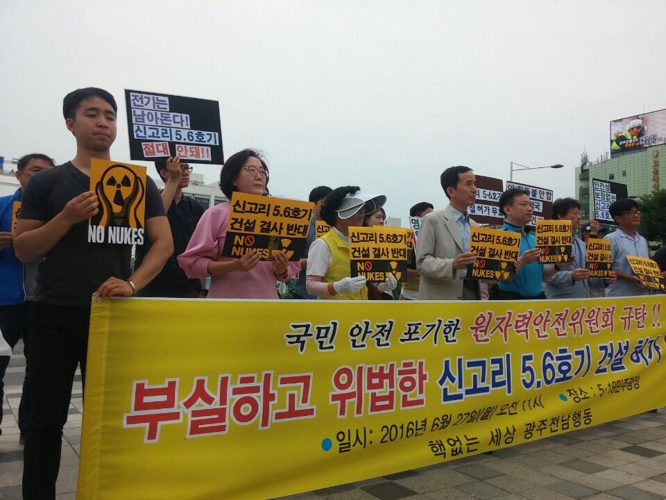 - 2016년 6월 27일(월) 오전 11시, 518민주광장에서는 신고리 5,6호기 건설 허가를 규탄하는 기자회견이 펼쳐졌습니다. 지난 6월 23일, 원자력안전위원회가 표결을 통해 불과 3차례의 논의끝에 건설을 허가했습니다. 결국 정부와 한수원은 국민의 안전은 염두에 두지 않고, 전력공급과 지역경제활성화라는 명분도 안되는 이유를 들어서 결정을 강행했습니다.
