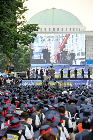 서울 여의도 국회 앞 의사당대로는 한낮 뜨거운 아스팔트 열기를 헤치고 ‘재벌개혁과 현대기아차그룹사 공동교섭, 노동자 구조조정 중단’을 외치는 금속노조 대오로 가득 찼다.강두순 노조 부위원장 사회로 16시40분 무렵 본 대회를 시작한 국회 앞 ‘재벌개혁·제조업발전특별법 제정·외투자본 규탄·조선소 구조조정 분쇄·2016년 임단투 승리 7.22 금속노조 총파업 투쟁대회’에 경기, 경남, 경주, 광주전남, 구미, 대구, 부산양산, 서울, 울산, 인천, 전북, 쌍용차, 한국지엠지부 조합원 1만여 명이 참석했다.