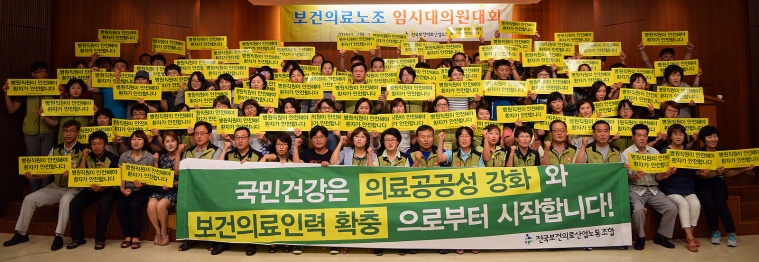 2015년 박근혜 정부는 ‘노동시장 구조개악’이라는 이름으로 임금피크제, 성과급제, 공공기관 2차 정상화 계획, 취업규칙 변경요건 완화 등을 밀어붙이려 하고 있다. 이번 임시대의원대회에서 보건의료노조는 박근혜 정부의 임금, 고용, 노동조건 개악에 맞서 민주노총과 함께 노동시장 구조개악 저지! 최저임금 1만원 쟁취! 공공기관 2차 가짜정상화 대책 저지! 의료민영화 저지! 투쟁을 결의했다.