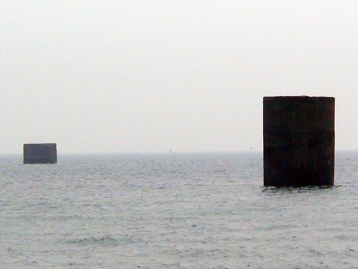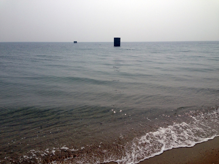 아무도 찾는 사람 없는 쓸쓸한 바닷가에 파도만이 무심하게 밀려오고 있습니다. 바다 한 가운데에 불쑥 튀어나온 두 개의 콘크리트 기둥이 지나는 이들의 호기심을 자극합니다.