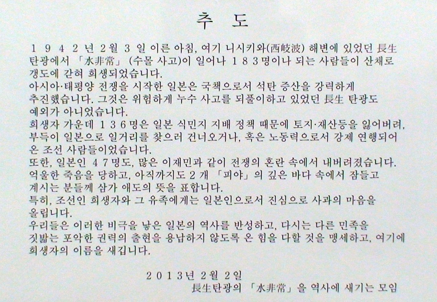 우베시의 협력을 얻어 추도비를 세우고자 했지만 강제동원 된 조선인들이 희생되었다고 분명하게 밝힌 추도비의 비문을 시 당국이 거부하여 결국은 시민들의 힘만으로 2013년 추도비를 세웠습니다. 추도비에는 희생된 조선 사람들 136명의 이름이 한 명, 한 명씩 모두 새겨져 있습니다.