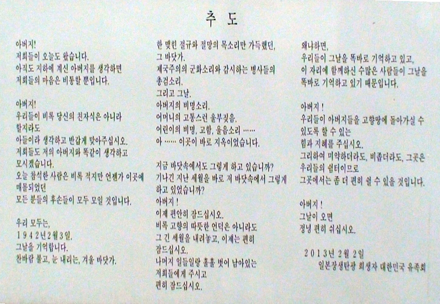 ▲ 유족들의 추도시 ⓒ 민족문제연구소