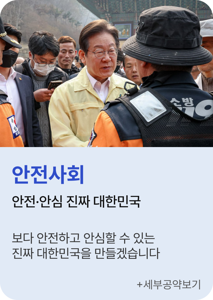재해‧재난 예방과 대응도 더 촘촘히 하겠습니다. 산불, 수해, 땅꺼짐(싱크홀), 항공사고 등 자연‧사회재난 전반에 대한 통합 대응 체계를 마련하겠습니다. 하수관 정비 등 도시형 물관리 시스템을 정비하고, 대규모 행사와 교통사고 예방도 사전에 체계화하겠습니다.
