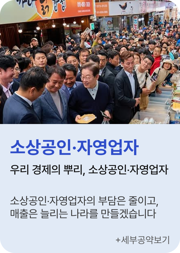 우리 경제의 뿌리인 소상공인과 자영업자를 확실히 살리겠습니다. 금융과 경영 부담을 낮추고, 마음 편히 일하며 장사할 수 있는 나라를 만들겠습니다.