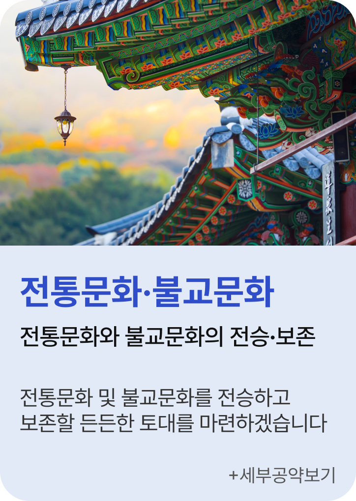 유네스코 인류무형문화유산인 연등회가 후세에 잘 전승될 수 있도록 전승관 건립을 추진하고 팔만대장경의 현대적 가치 인식 제고를 위한 지원을 모색하겠습니다.