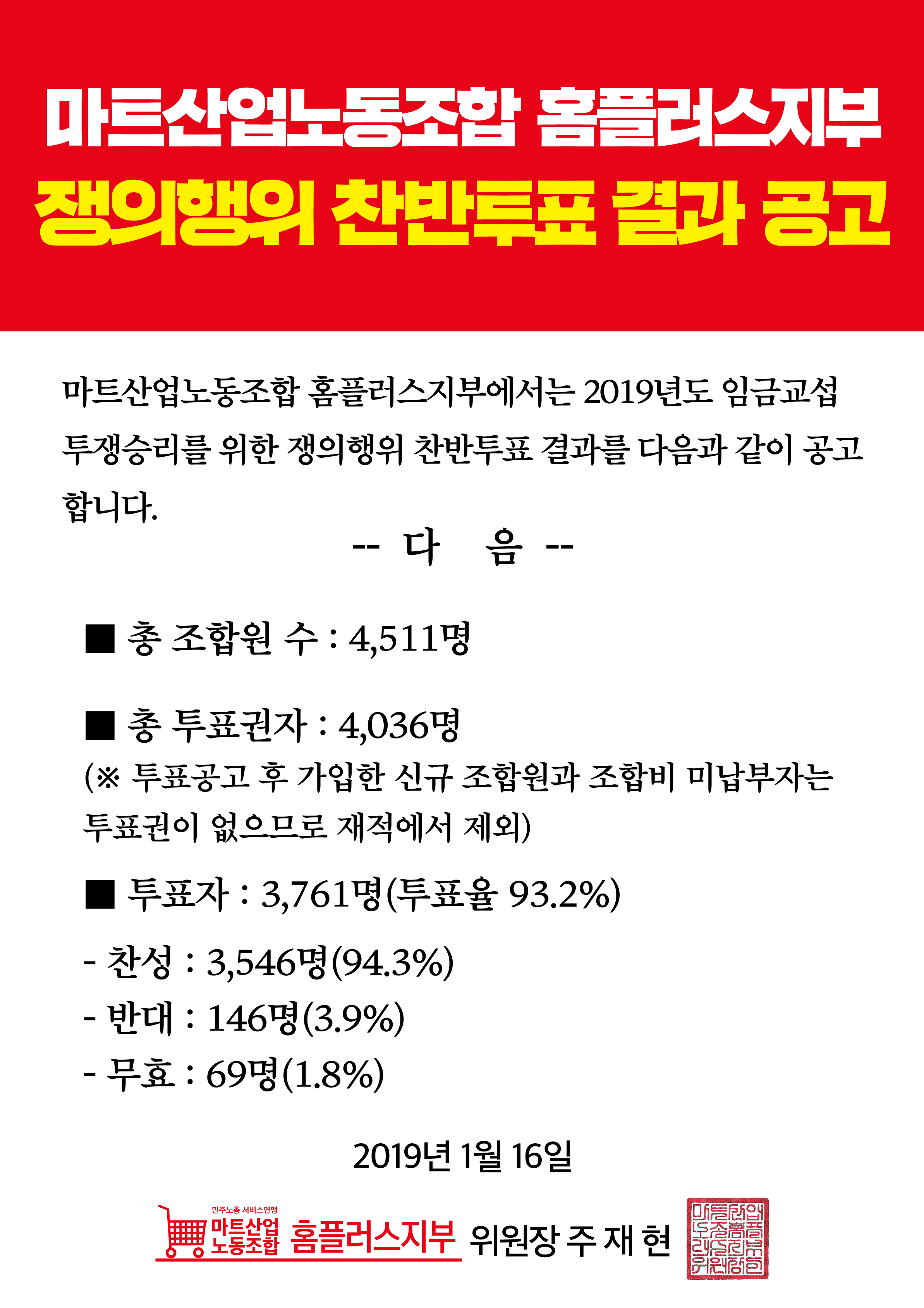 2019년 임금교섭 승리를 위한 쟁의행위 찬반투표가 찬성률 94.3%를 기록하며 압도적 찬성으로 가결되었습니다.
