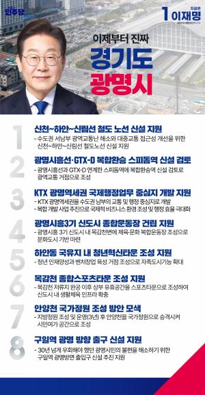 이재명 더불어민주당 대통령 후보가 광명시 발전 8대 공약을 공개했다. 특히 1번 공약인 을 최우선 과제로 명시하며, 광명 교통환경 개선에 대한 강한 의지를 드러냈다. 이 후보가…