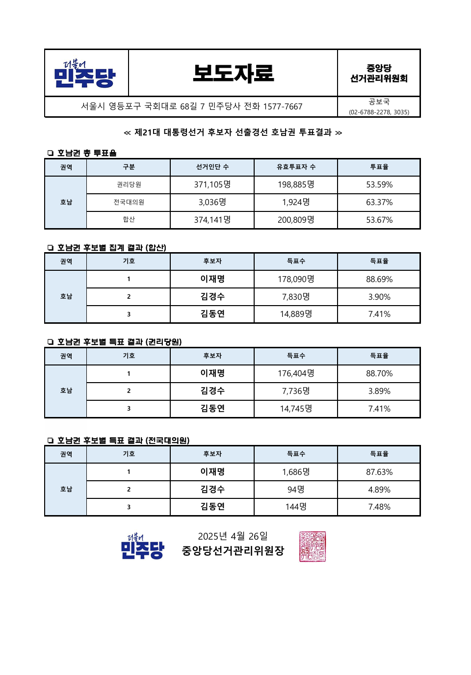 더불어민주당 제21대 대통령선거 후보자 선출을 위한[호남권] 권리당원 자발적 ARS투표 안내 더불어민주당 제21대 대통령후보자 선출을 위한 권리당원 자발적…