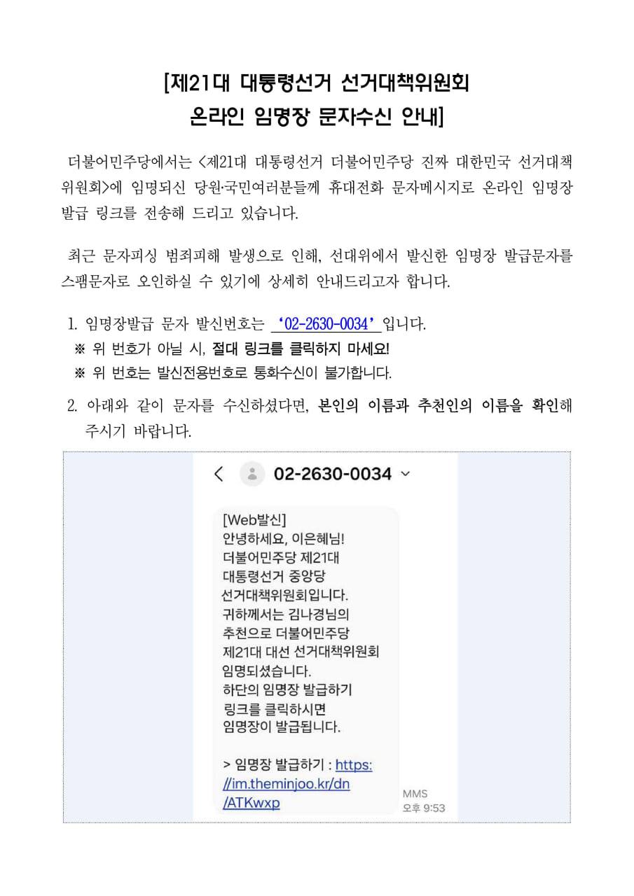민주당 중앙당 - 민주당, 후보 관계자 등 사칭 사기 주의 안내