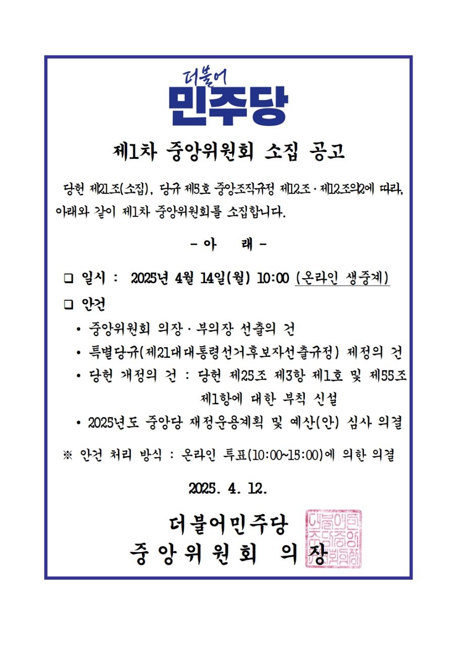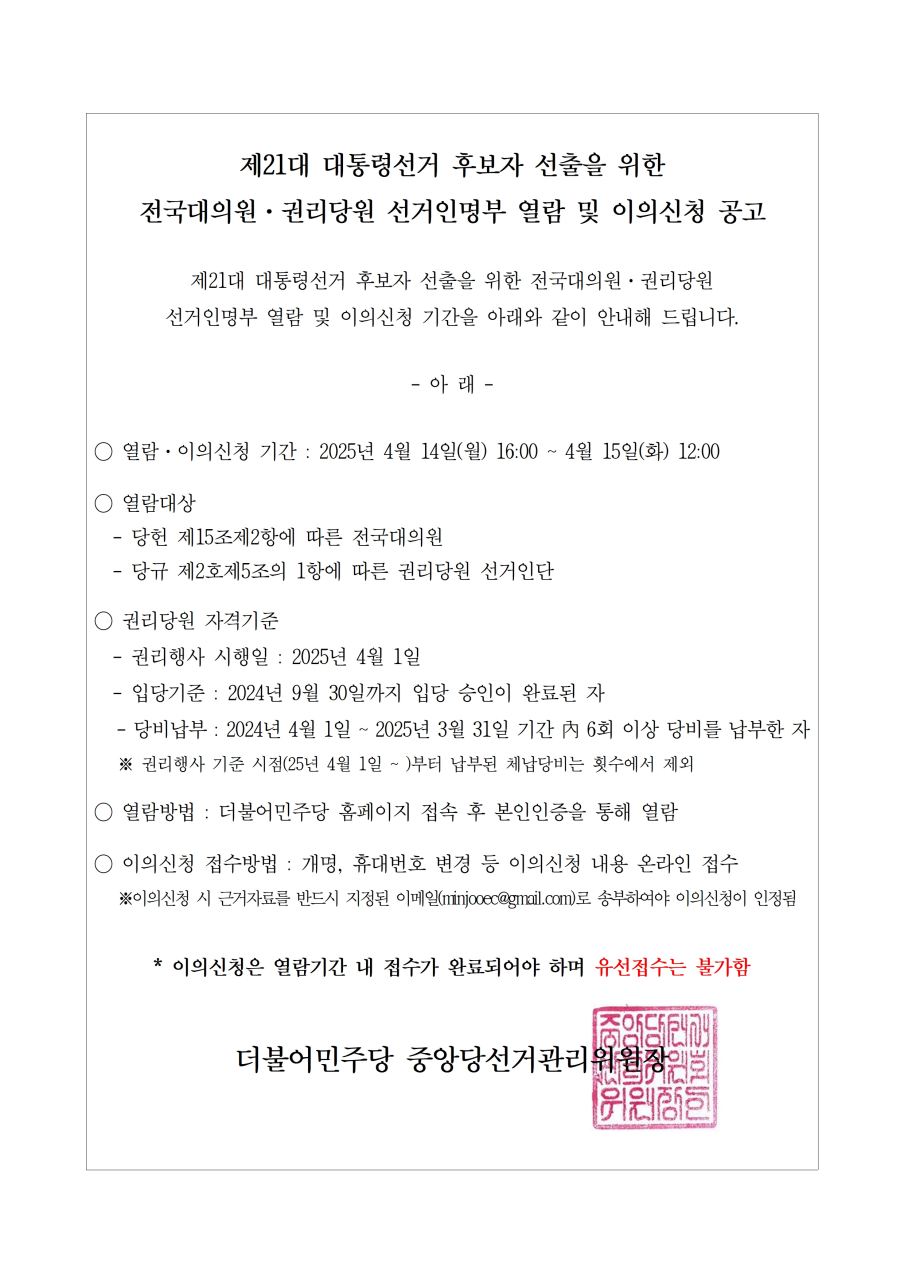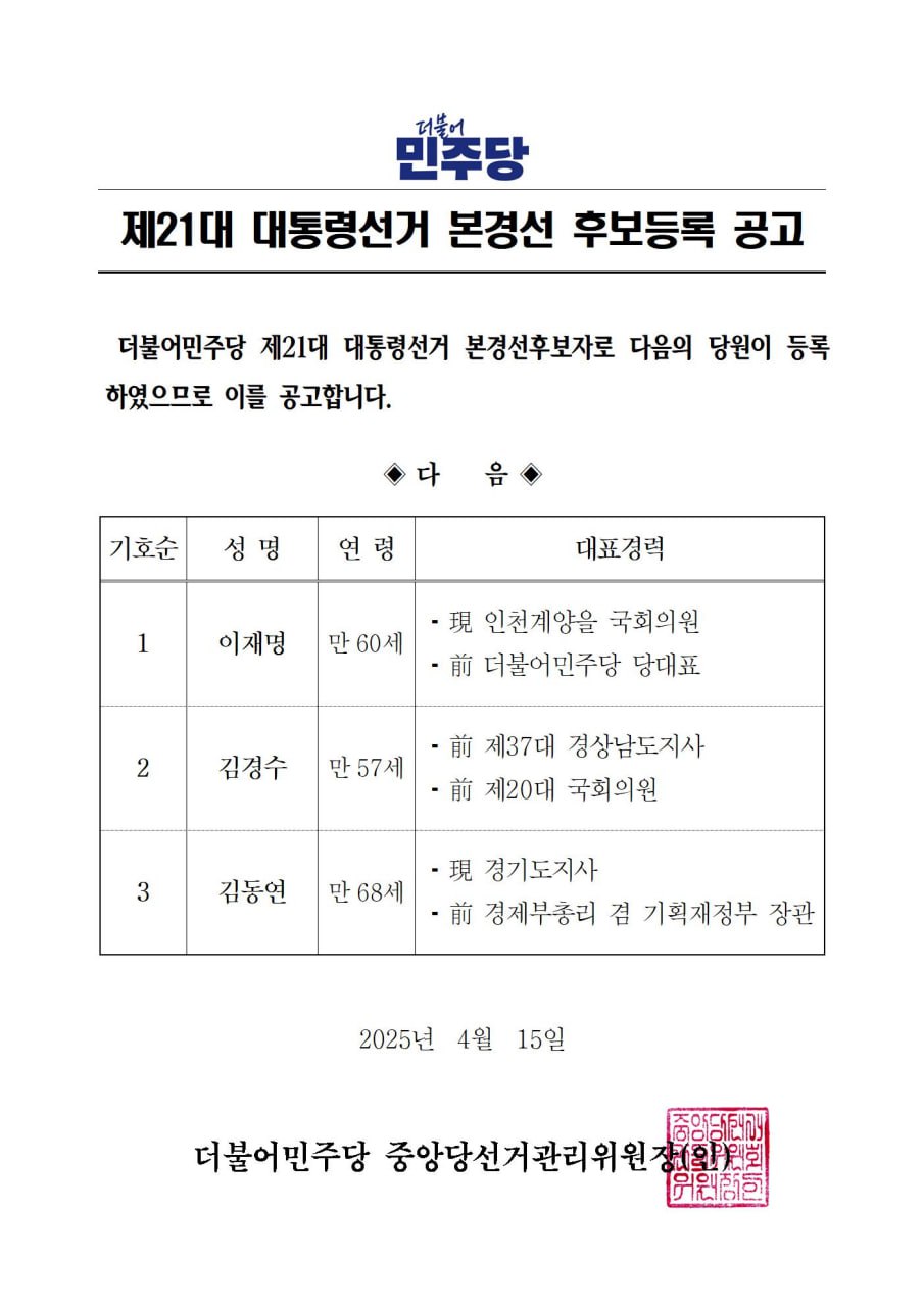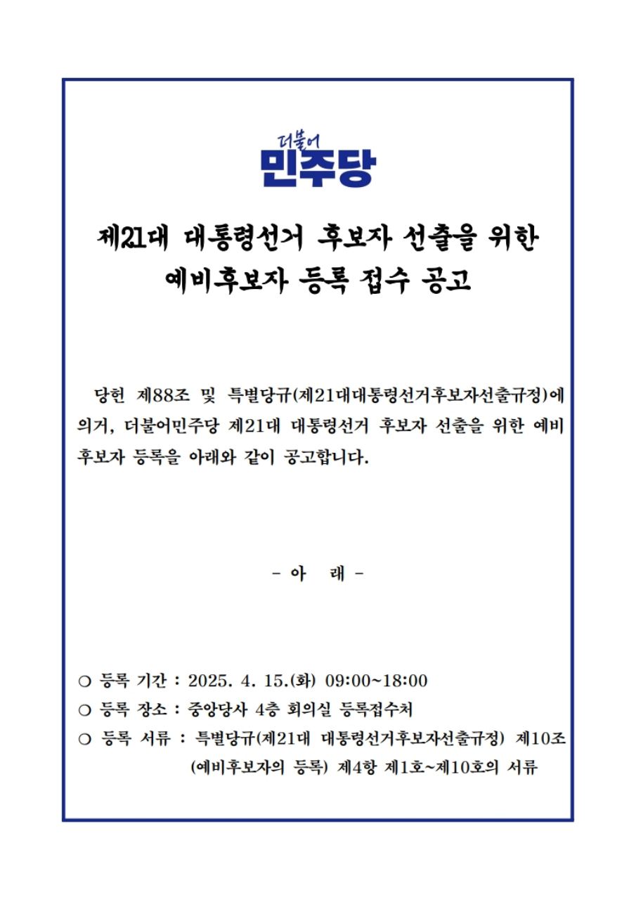 중앙당 - 제21대 대통령선거 본경선 후보등록 공고