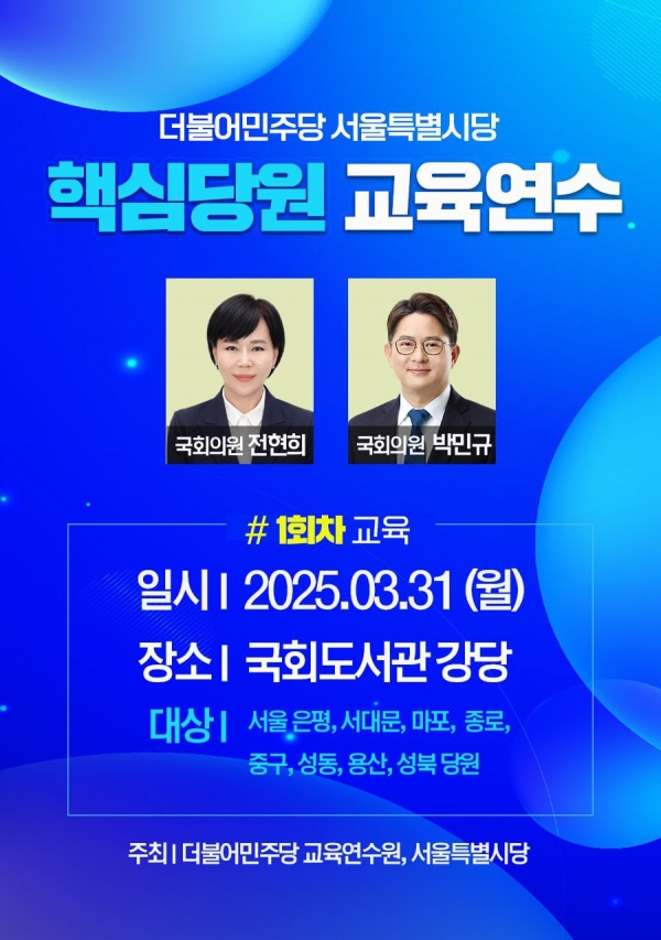2025 서울시당 당원교육연수 안내 민주당과 당원이 함께 나아갈 방향과 역할을 고민하는 자리!당원 여러분의 많은 참여를 기다립니다 - 주제: 민주당과 당원이 나아가야할 방향과…