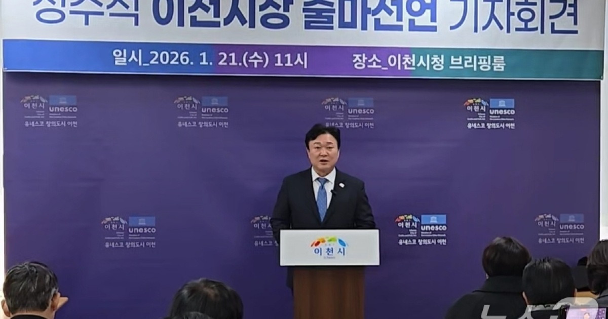 (이천=뉴스1) 김평석 기자 = 성수석(56) 더불어민주당 경기 이천시지역위원장이 21일 이천시청 브리핑룸에서 기자회견을 갖고 6.3지방선거 이...