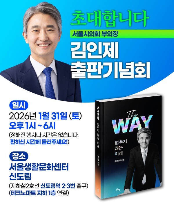 김인제 서울시의원(부의장, 더불어민주당, 구로2)이 이달 31일(토) 출판기념회를 연다. 지난 2022년에 지방선거에서 구청장 출마를 표방한 적...