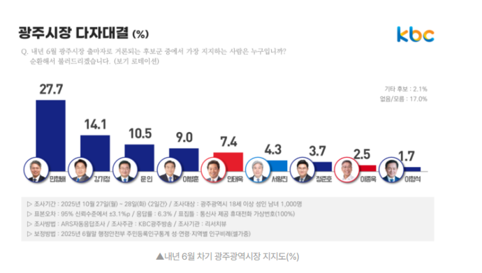 [지방선거 광주시장·구청장 여론조사] 광주시장 민형배 27.7% 오차범위 밖 앞서…강기정·문인·이병훈 순 - namdonews.com