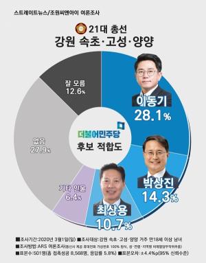 이동기 전이동기 더불어민주당 전 속초·고성·양양 지구당 위원장이 스트레이트-조원씨앤아이가 실시한 '4·15 총선' 민주당 해당 지역구의 예비후보 적합도 여론조사에서…