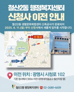 광명시 철산2동 행정복지센터(동장 서혜승)는 오는 11일부터 신청사(광명시 시청로 102, 철산2동 생활문화복합센터 1층)에서 업무를 시작한다.이번 신청사 이전으로 주민들은 더욱…