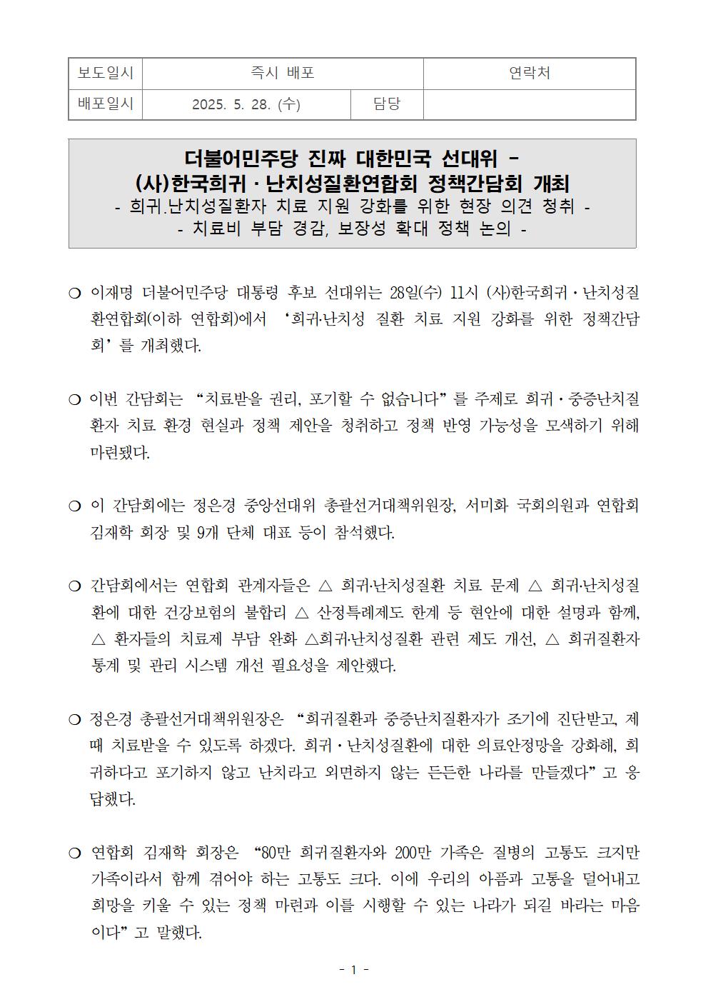 정책간담회4.jpg정책간담회3.jpg정책간담회2.jpg정책간담회1.jpg(수정)250528 (보도자료) 더불어민주당 진짜 대한민국 선대위 - (사)한국희귀·난치성질환연합회…