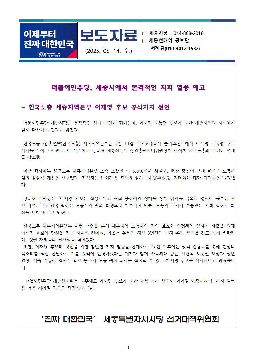 민주당 세종시당 - [보도자료]한국노총 세종지부 더불어민주당 지지선언