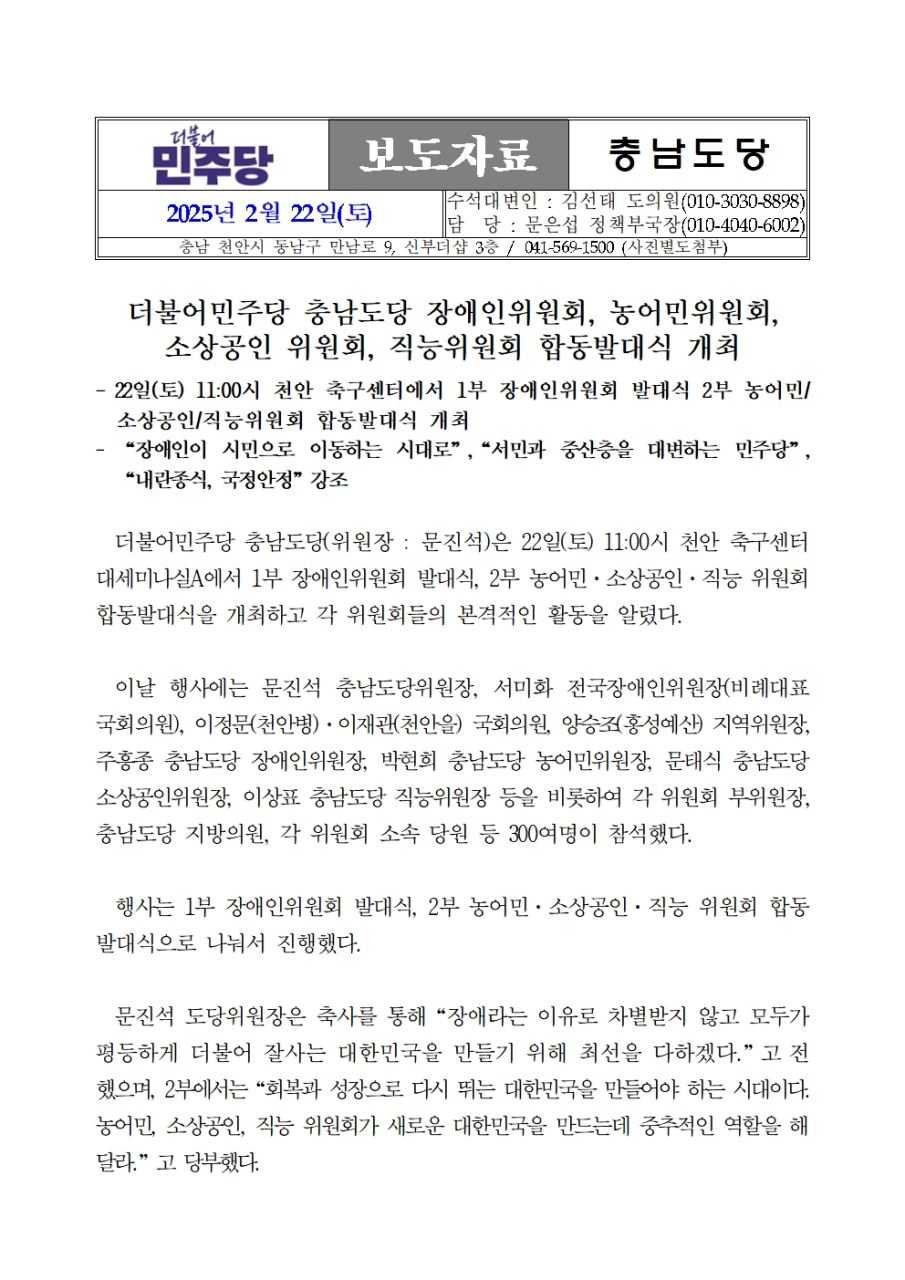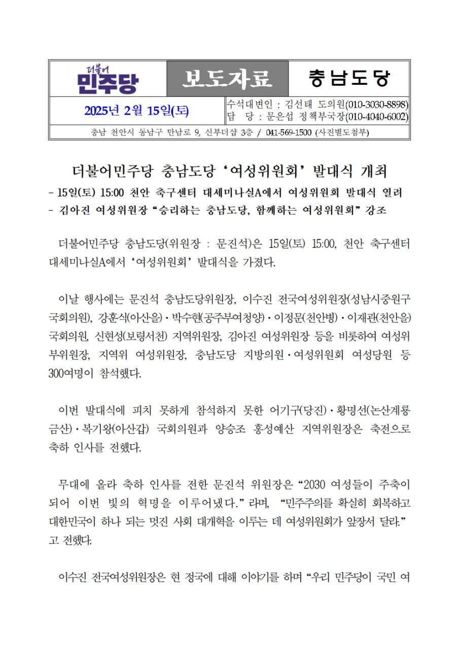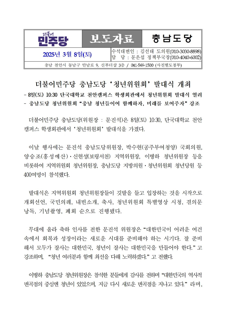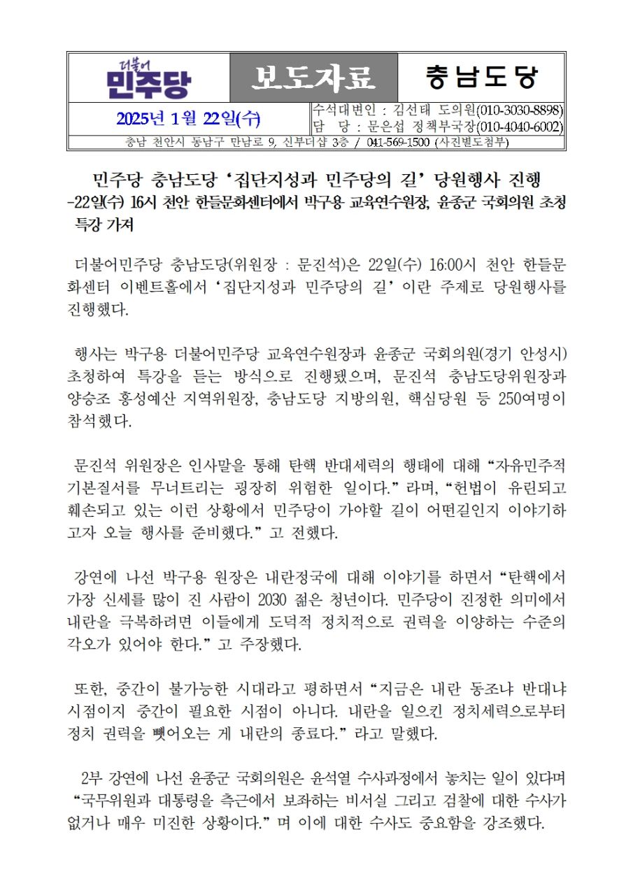 - 9일 10:30 충남 당원 500여명 모여 발대식 진행,“김건희 특검 촉구! 국정농단…