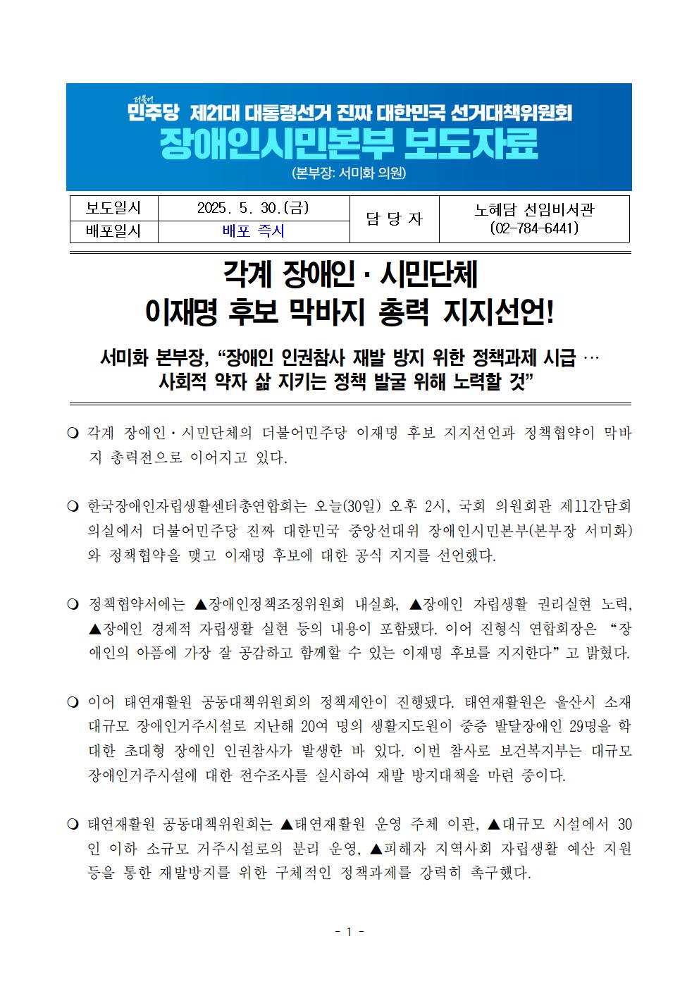 250530_장애인시민본부_보도자료_각계_장애인·시민단체_지지_선언_및_정책_협약.pdf공유