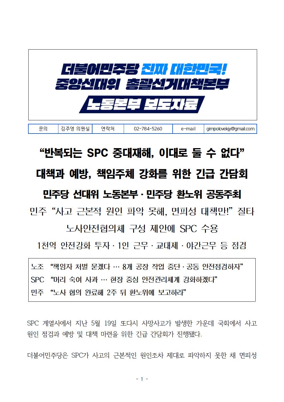 민주당 중앙당 - 진짜 대한민국 중앙선대위 노동본부, “반복되는 SPC 중대재해, 이대로 둘 수 없다” 대책과 예방, 책임주체 강화를 위한 긴급 간담회