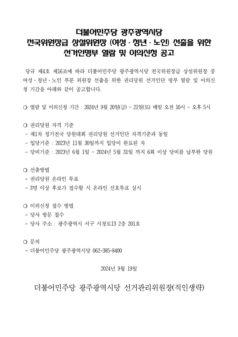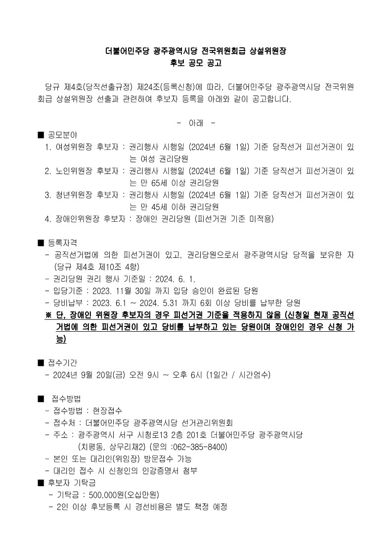 더불어민주당 광주광역시당 전국위원회급 상설위원장 선출 관련 서류는 파일로 첨부했습니다.