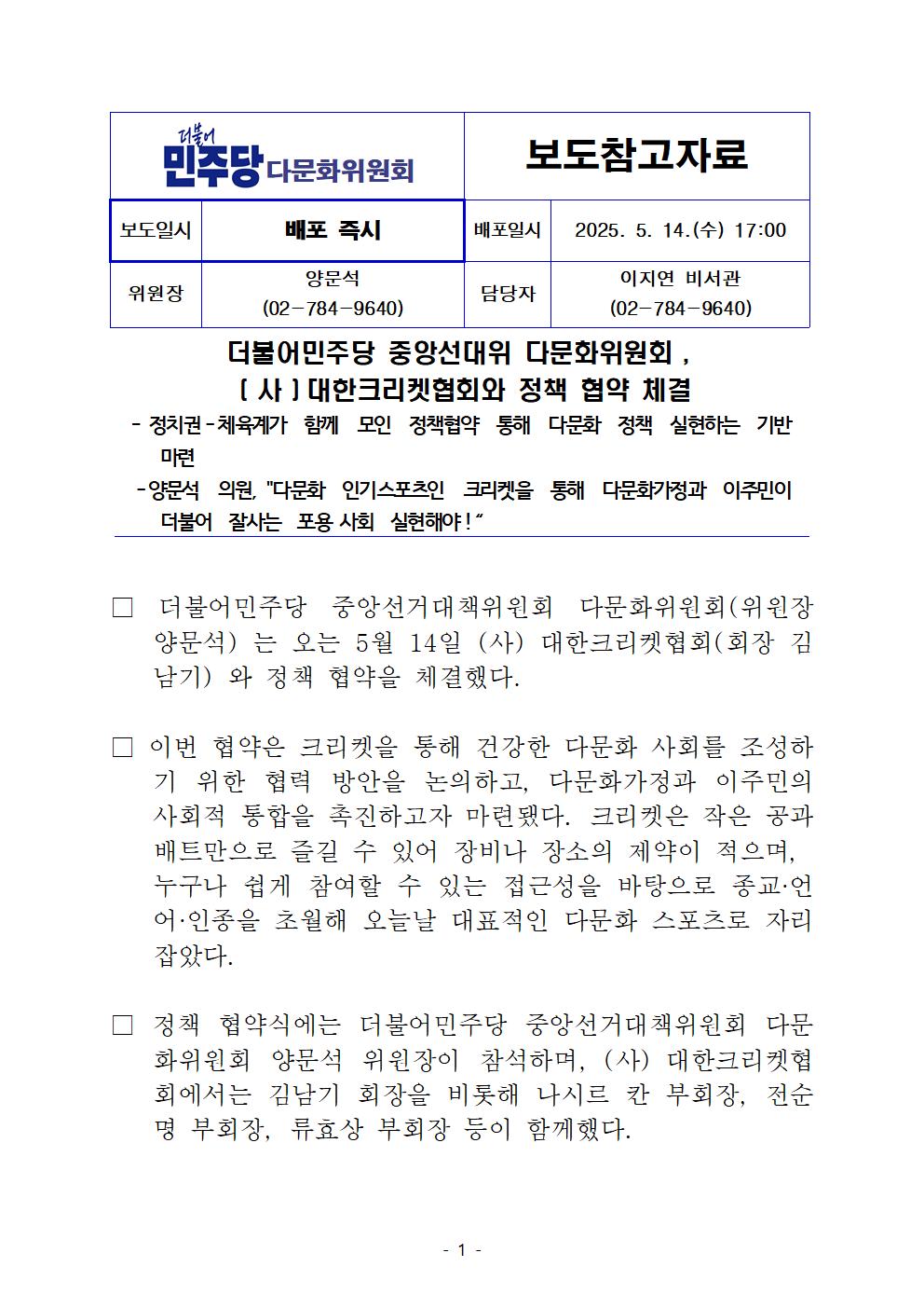 250514_보도자료_더불어민주당_중앙선대위_다문화위원회_크리켓협회_정책협약식.pdf250514_다문화위_보도자료_대한크리켓협회_정책_협약_체결.pdf공유