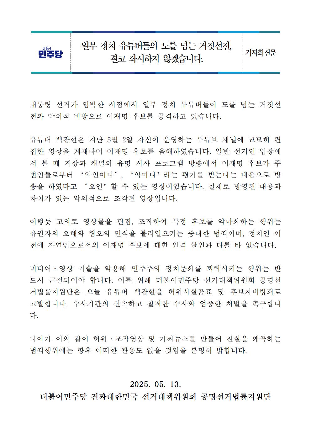 더불어민주당 가짜뉴스대응단 민주파출소 일일브리핑 (5.13, 화)