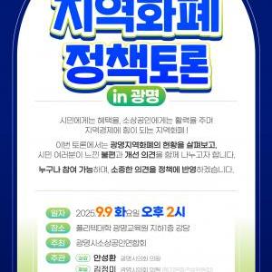 광명지역화폐의 현황과 개선 방향을 두고 시민과 소상공인이 함께 머리를 맞대는 정책토론회가 열린다. 오는 9월 9일(화) 오후 2시, 폴리텍대학 광명교육원 지하1층 강당에서…