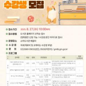 광명시(시장 박승원) 소하도서관은 오는 27일부터 ‘2025년 하반기 열린도서관학교’ 수강생을 모집한다.이번 프로그램은 어린이부터 성인까지 누구나 참여할 수 있는 다양한 독서·…