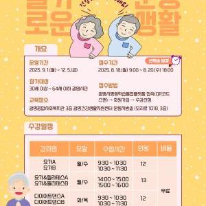 광명시 건강생활지원센터가 오는 18일 오전 9시부터 20일 오후 6시까지 ‘슬기로운 운동생활 3기’ 참가자를 선착순 모집한다.프로그램은 오는 9월 1일부터 12월 5일까지…