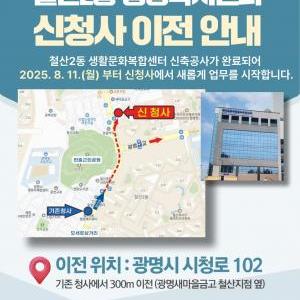 광명시 철산2동 행정복지센터(동장 서혜승)는 오는 11일부터 신청사(광명시 시청로 102, 철산2동 생활문화복합센터 1층)에서 업무를 시작한다.이번 신청사 이전으로 주민들은 더욱…