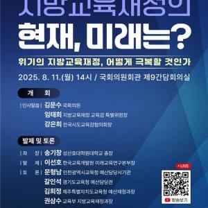 지방교육재정 안정화를 위한 국회 토론회가 열린다.전국시도교육감협의회는 11일 오후 2시부터 국회의원회관에서 위기의 지방교육재정을 어떻게 극복할 것인가를 주제로 토론을 가진다.…
